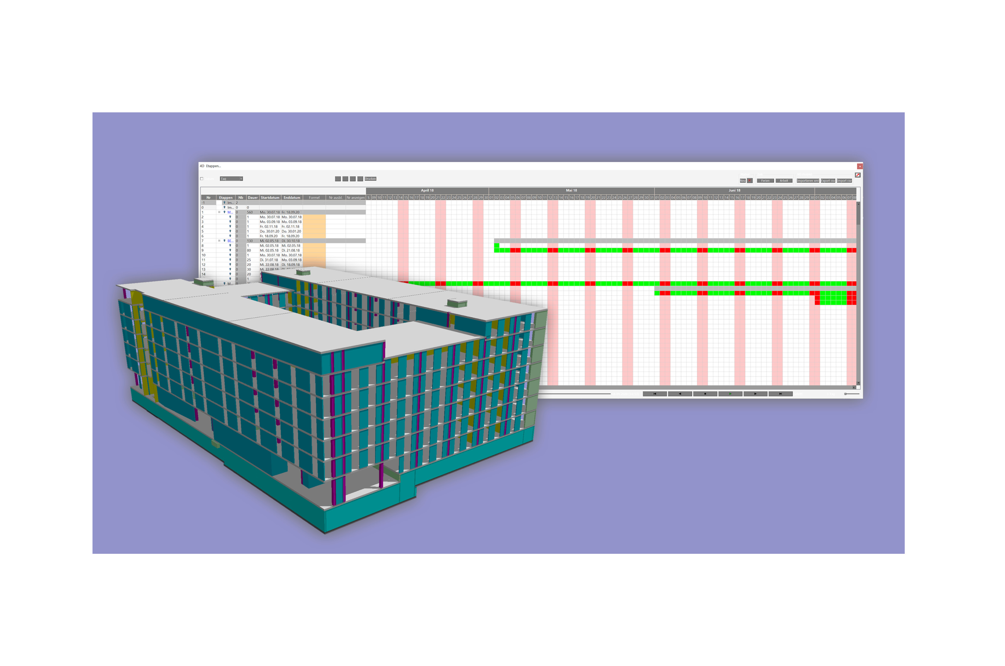 In the 4D Stages dialog, you can import MS Project data or create your own construction stages. You can link these to elements and show or hide them on the desired date. The planned construction process can be imported into MS Project to use it as a construction program.