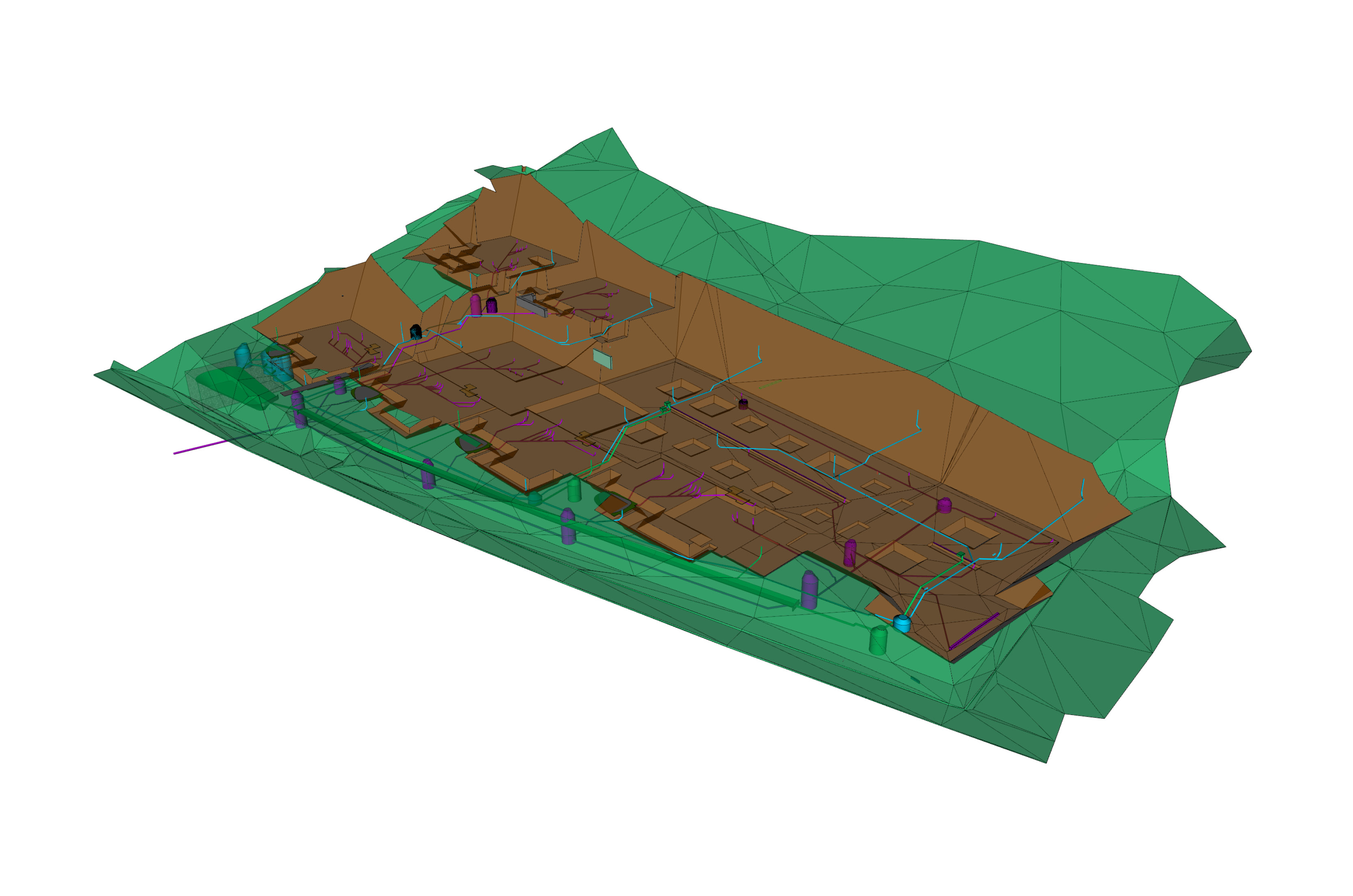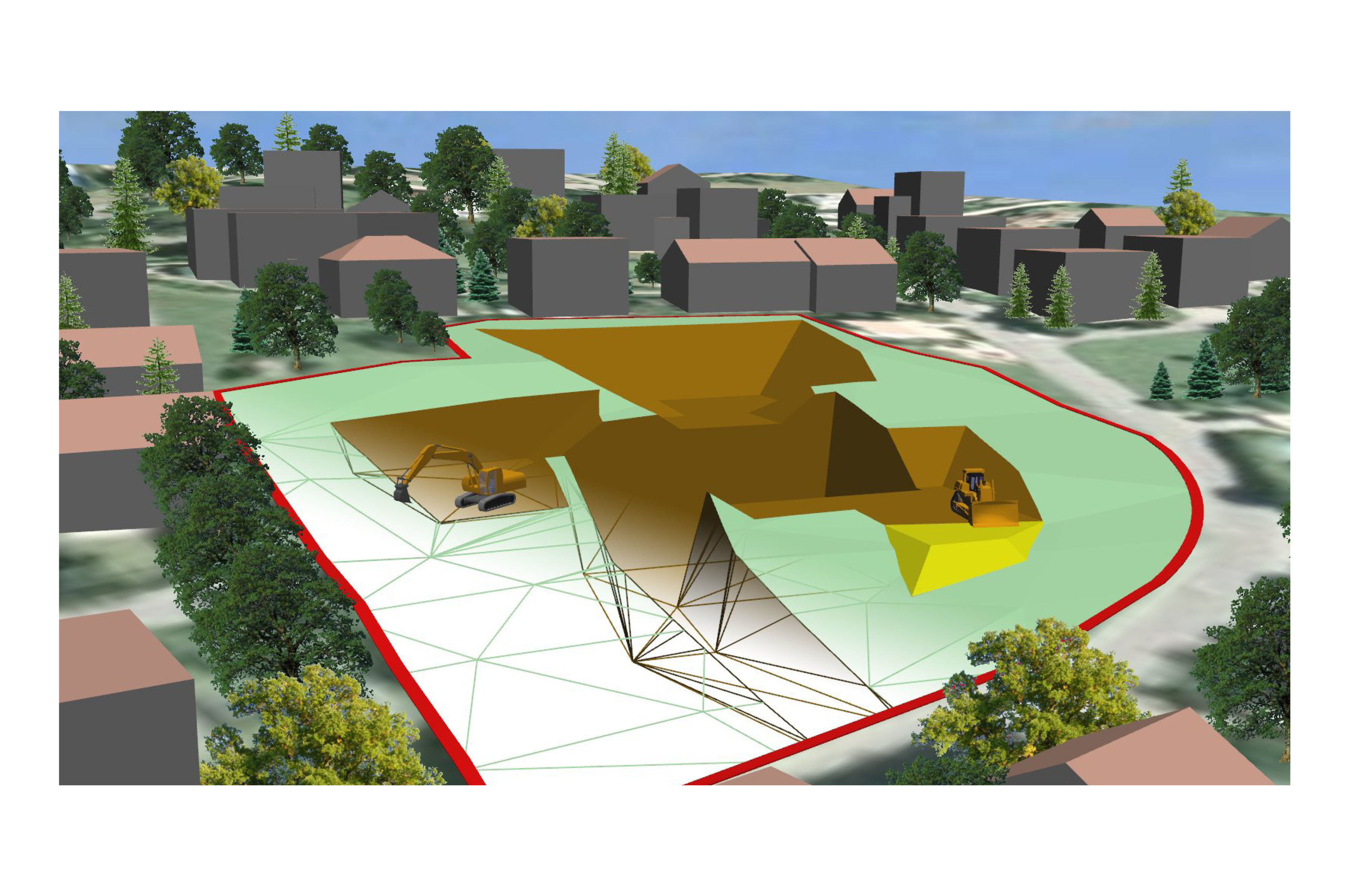 Excavations can be modeled to visualize the excavation in three dimensions and to determine the quantities. Nodes can be set to be further used for surveying.